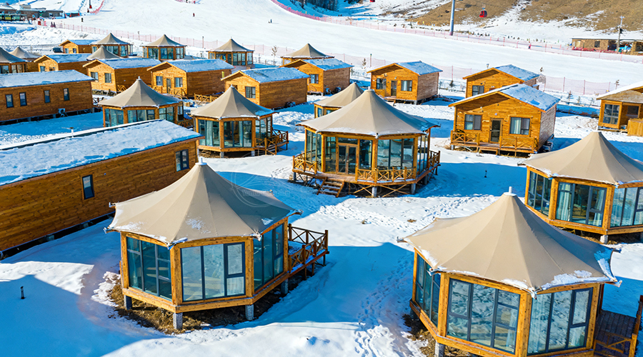 八边形帐篷酒店的设计灵感源于对自然的敬畏与追求。在材料选择上,通常采用高强度铝合金框架,搭配PVDF膜材或双层中空玻璃,不仅确保了结构的稳固与耐用,还提供了极佳的防风、防晒、隔热和保暖性能。在外观上,八边形的框架线条流畅,搭配古朴的木质设计或原色木纹挂板,使得整个帐篷与自然环境和谐相融,为住客带来一种返璞归真的感受。