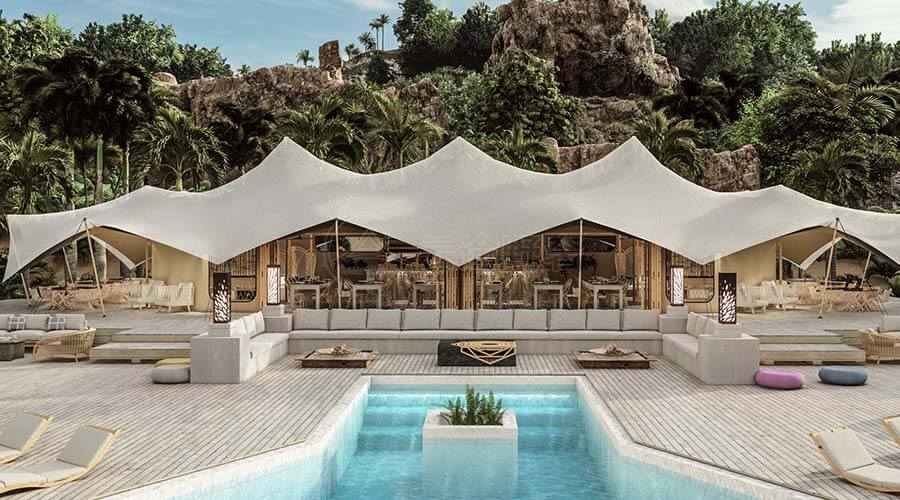 在设计上,营地酒店帐篷追求与自然环境的和谐共生。它们或借鉴传统帐篷的形态,融入现代设计元素,创造出既复古又时尚的外观;或采用大胆的色彩与造型,成为自然风景中的一抹亮色。无论是简约的线条,还是繁复的图案,每一种设计都力求与周围的自然景观相呼应,形成一幅幅生动的画面。