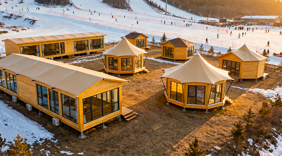 走近些,才更真切地感受到这份震撼。每一顶帐篷都稳稳地安置在精心搭建的木质平台上,与周围的雪景相得益彰。帐篷的外观设计简洁而富有现代感,透明的部分巧妙地融入其中,既能让人在屋内尽情欣赏外面的冰雪世界,又保证了充足的采光。