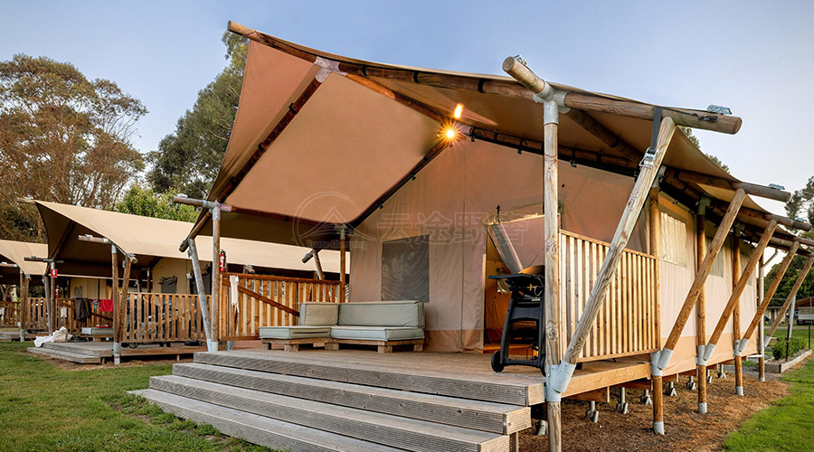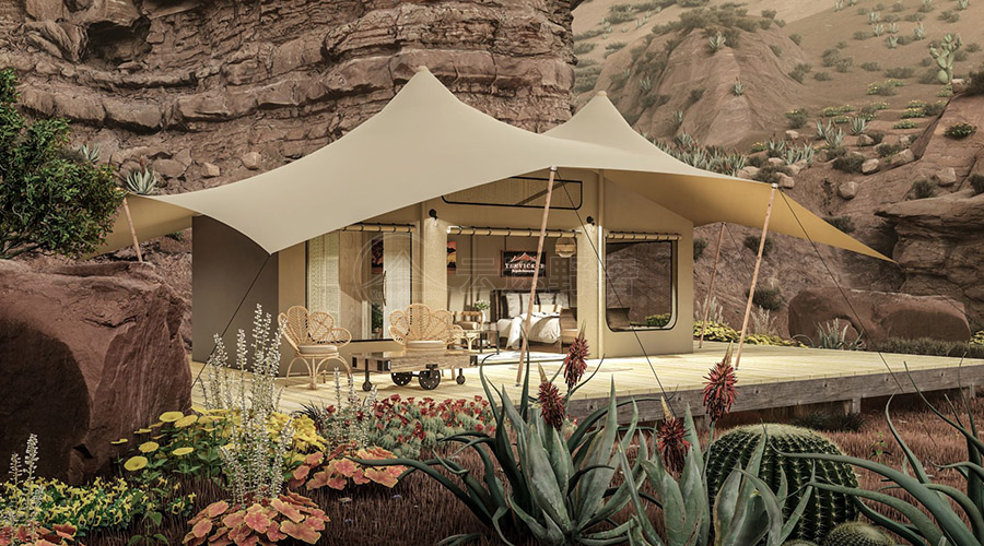 帐篷酒店寿命的突破,始于对建筑膜材的颠覆性创新。传统篷布因抗撕裂性差、易老化,寿命通常不超过5年,而现代帐篷酒店采用高强度建筑膜材,如防火阻燃PVC涂层帆布与PTFE玻璃纤维膜,其抗拉强度达3000N/5cm,抗紫外线老化性能提升5倍,在沙漠、雪山等极端环境中仍能保持15年以上使用寿命。k8凯发篷房的专利技术更进一步,通过纳米自清洁涂层与双层隔热结构,使膜材兼具自修复与节能功能,在云南高海拔地区实测显示,其帐篷酒店外膜在20年使用后仍保持90%以上的原始强度。